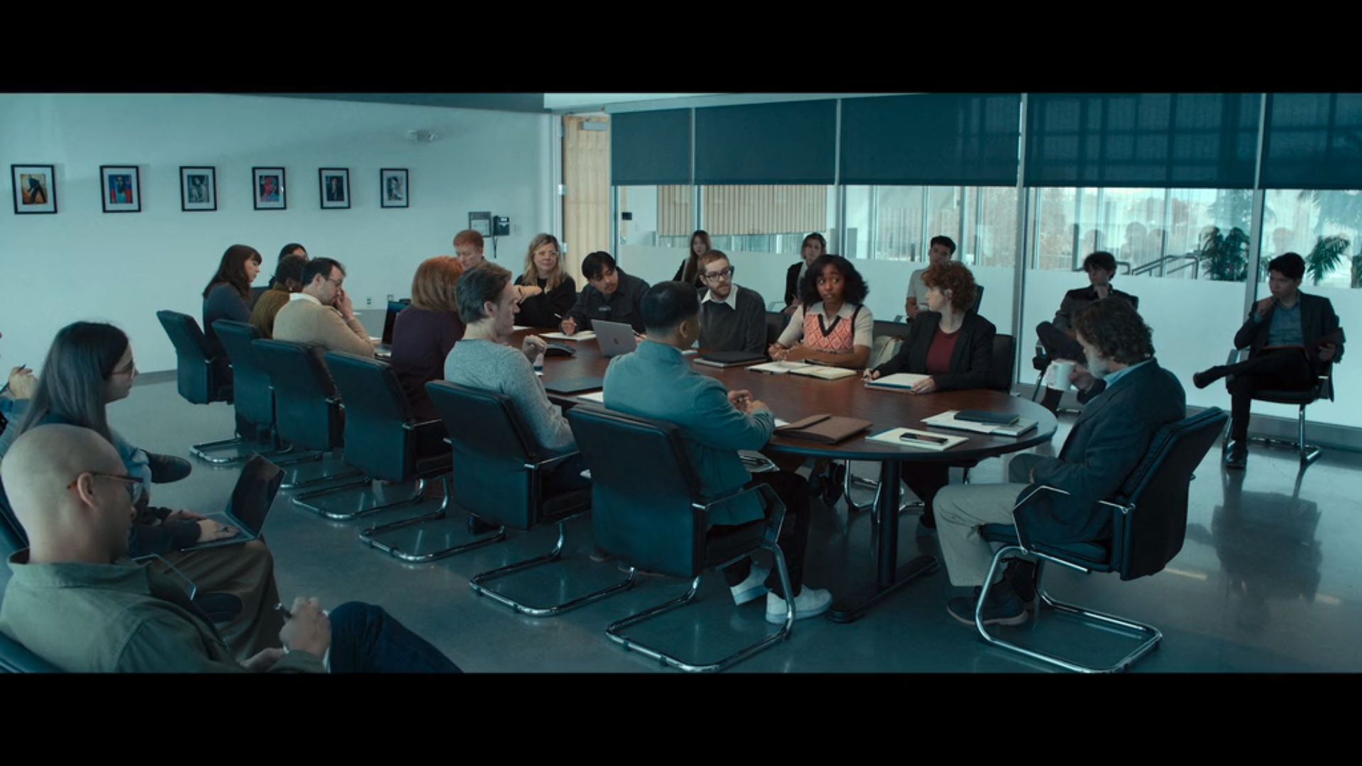 Instead, Green has the camera placed right there on the table (so it seems), so we look straight on at Ariel, and straight on at Stan. This gives us, the audience, our own lens or perspective to look through, despite the fact that the close up of Ariel pitching her story initially brings us close to her nerves of the moment, so when we switch to the medium long shot of Stan, yet he's center frame, it feels as though we're in Ariel's shoes, made to feel small as we stare down her boss, despite the fact that we, the audience, are technically viewing from the middle of the table.