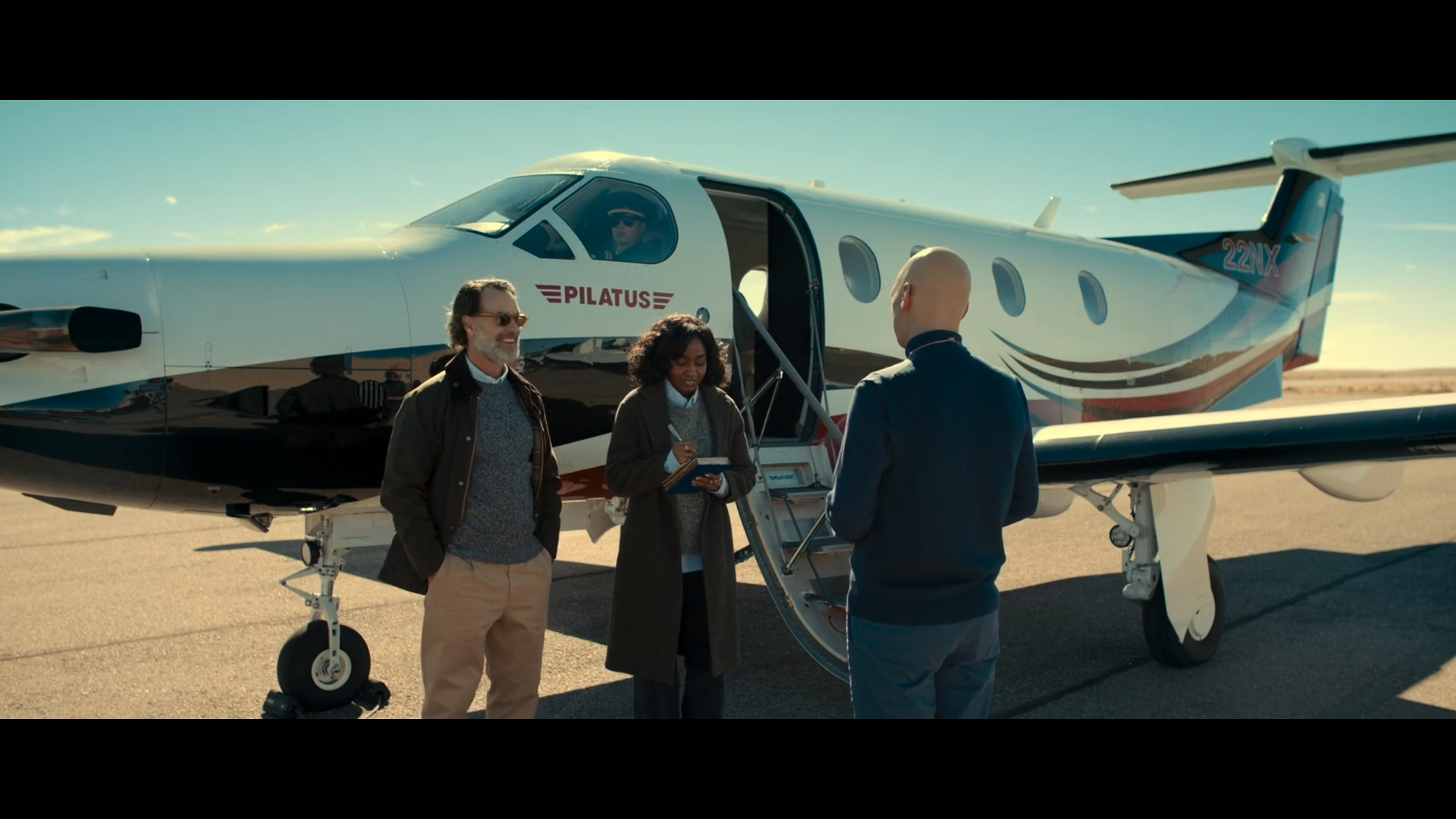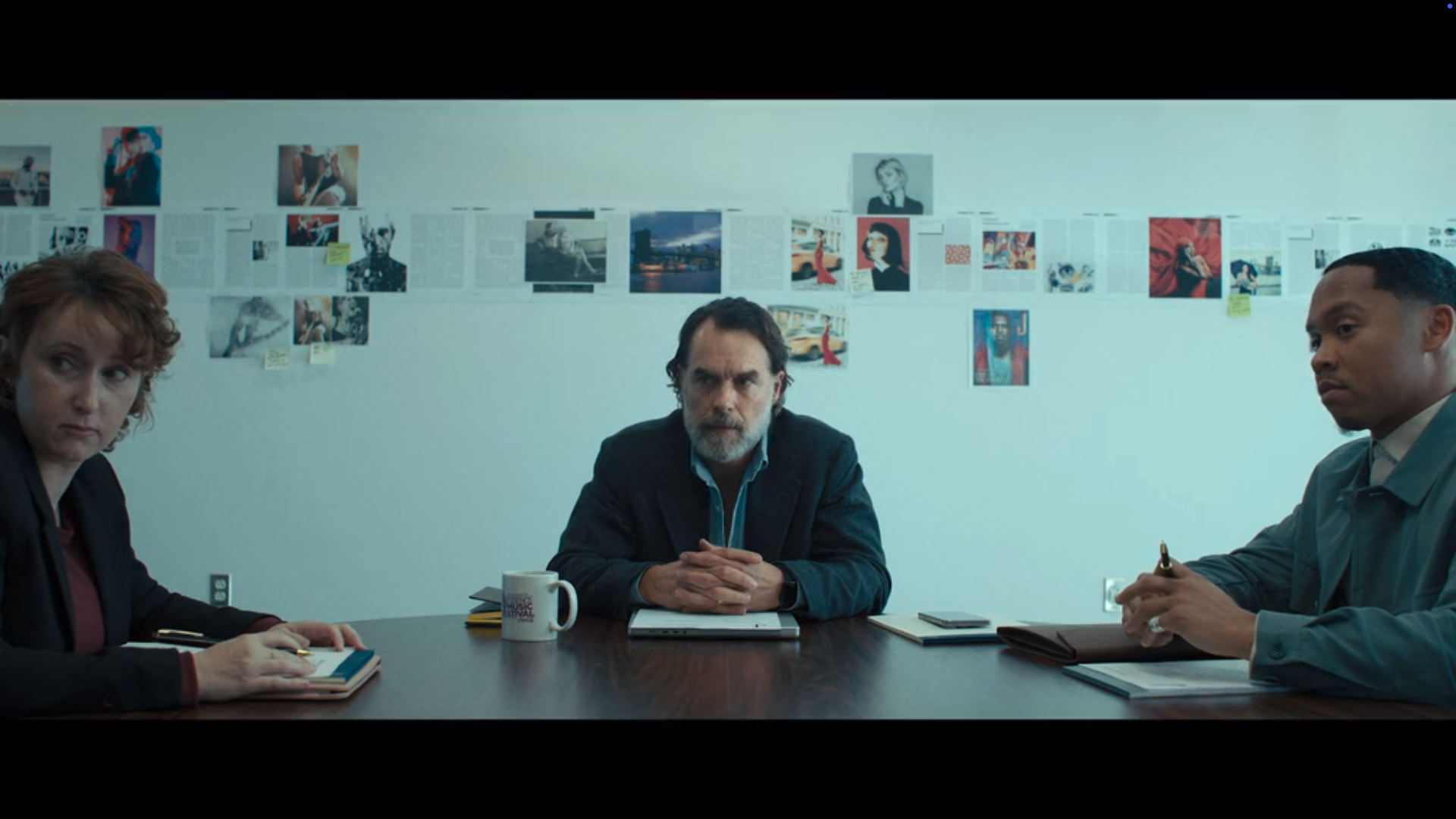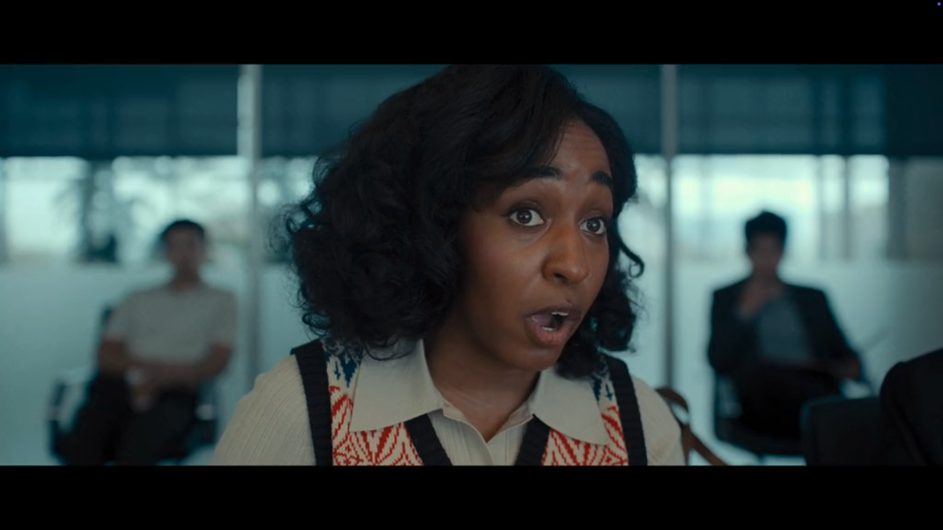 In the opening sequence, I initially barely noticed the two men flanking Ariel (Ayo Edibiri) as she pitches her story, and that makes sense, they're blurred out of focus in the background.