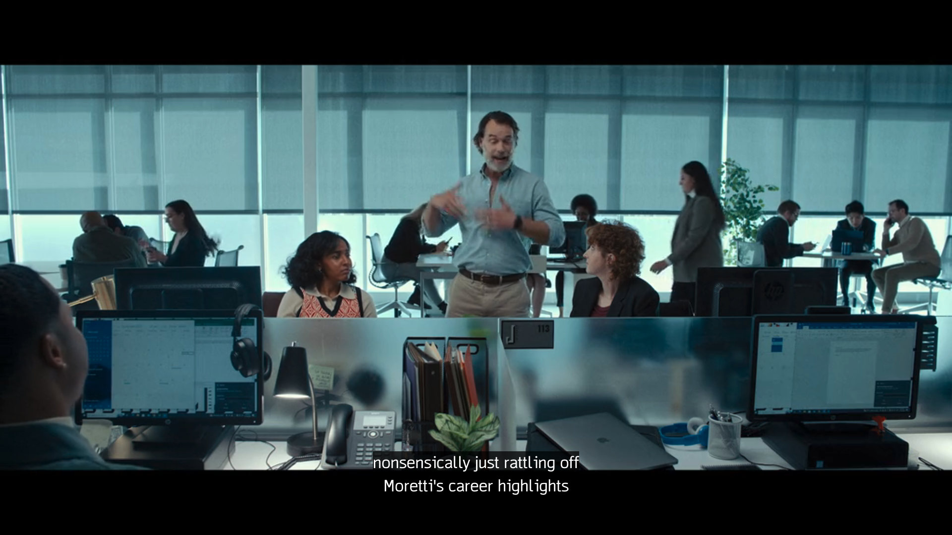 It's only when the camera flips as we look to her boss's response, that I noticed the "3 shot" - her boss, Stan, staring right at us, with other staff members also on either side of him.