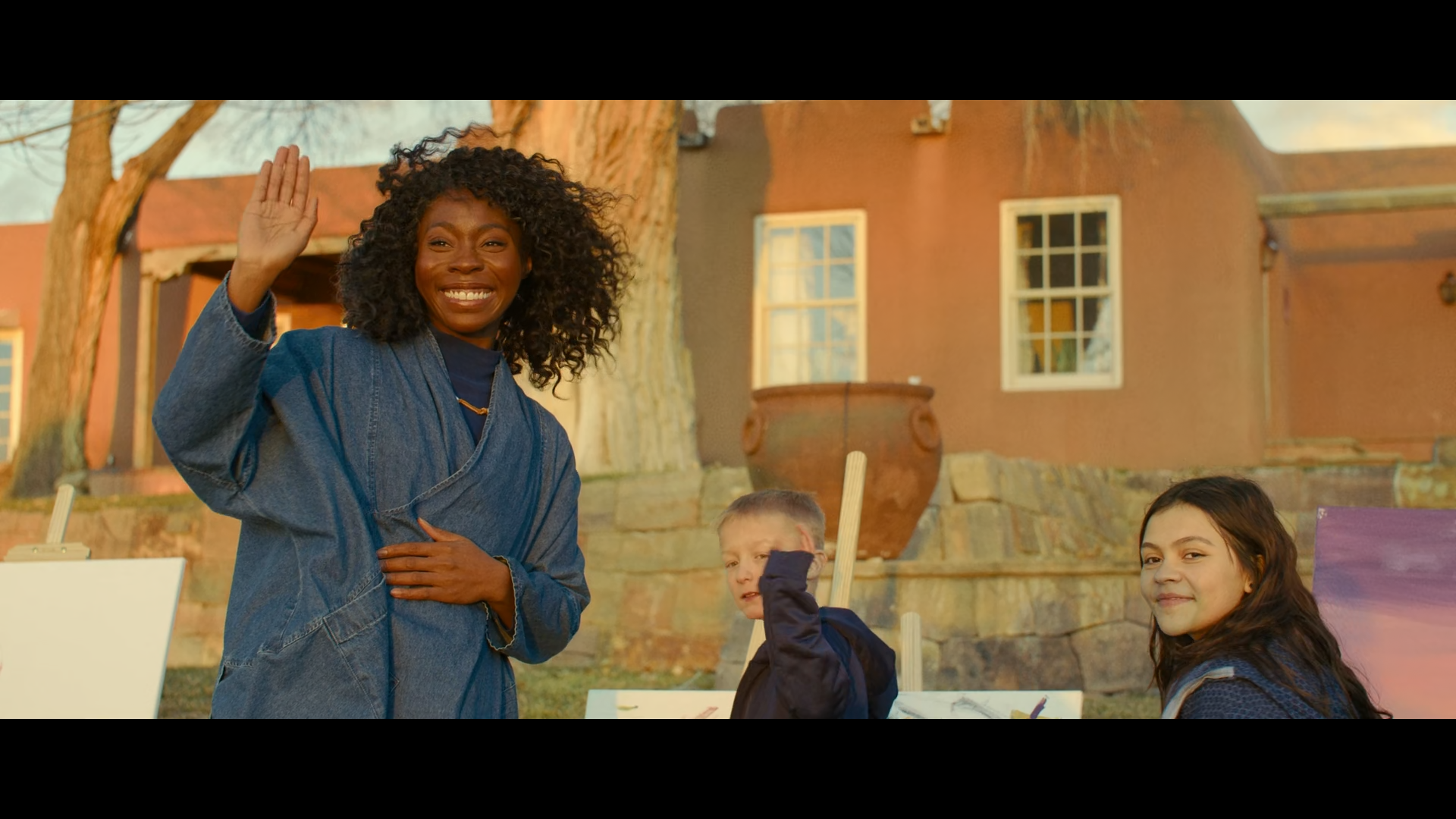 In this moment, Ariel is running around the enclave and this woman waves to her. Upon closer inspection, you'll notice the boy center framed also waving, too. But is the significance here really about the three people in the shot, or do the boy's and the girl's presence help balance out the visual composition of the woman standing to the left of the frame?