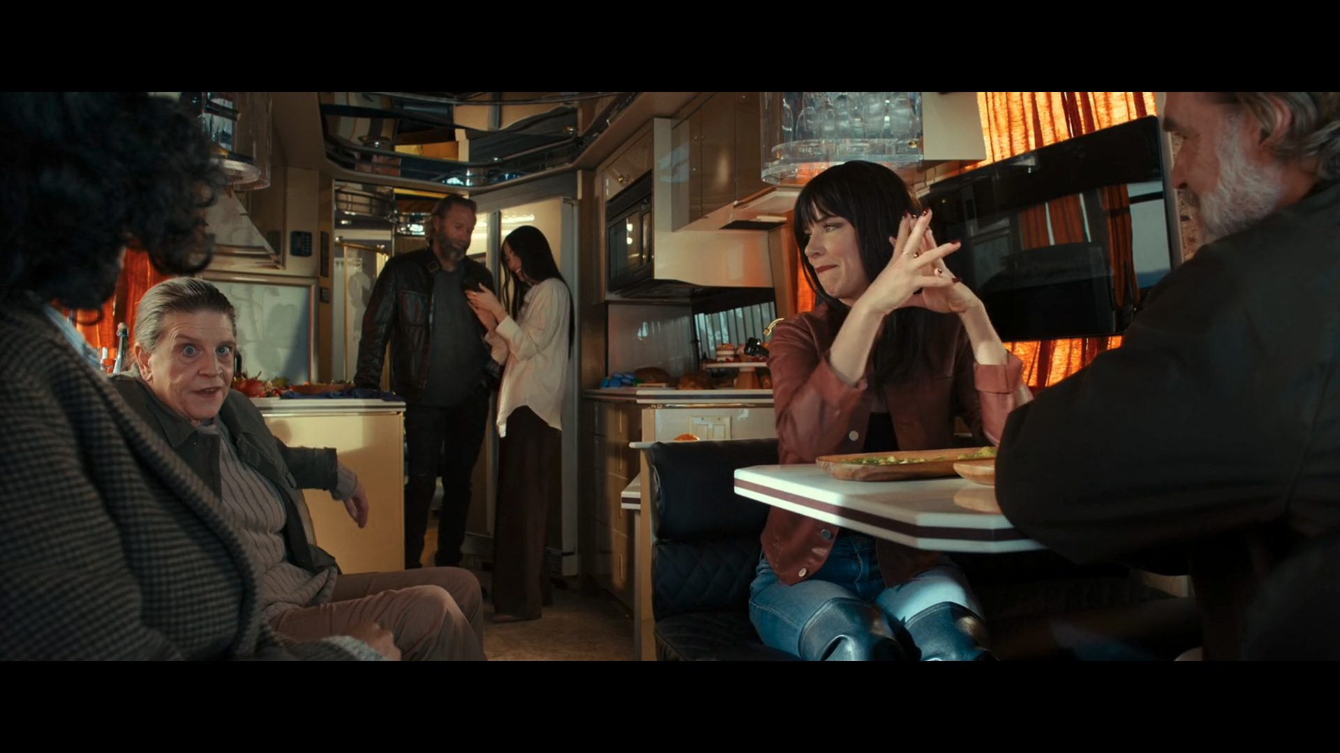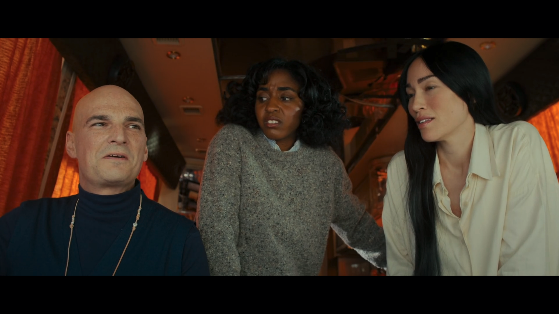 And here's another example of a shot that's balanced in its composition. Bianca takes up the left side of the frame, seated across from Clara, who takes up the right side of the frame. They're both in the mid ground, whereas Bill Lotto and Emily Katz stand together in the center of the frame, split between Bianca and Clara, though they're in the background.